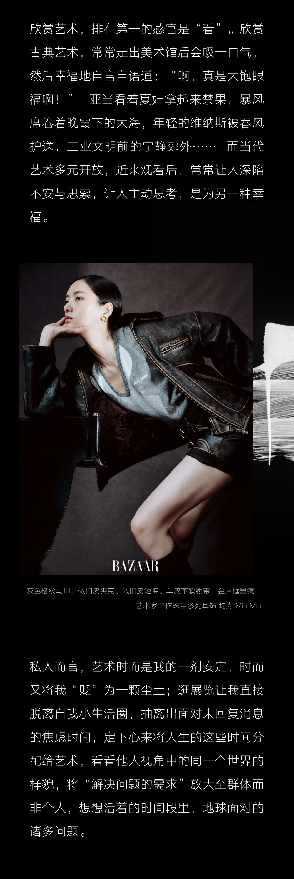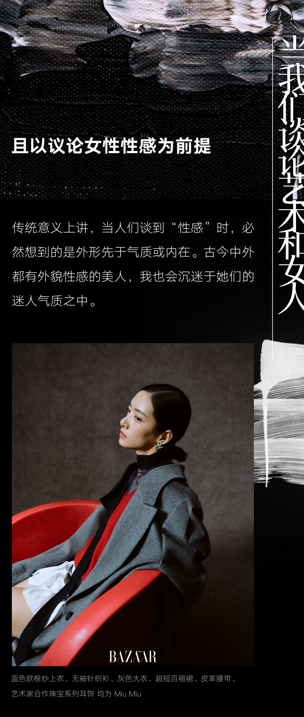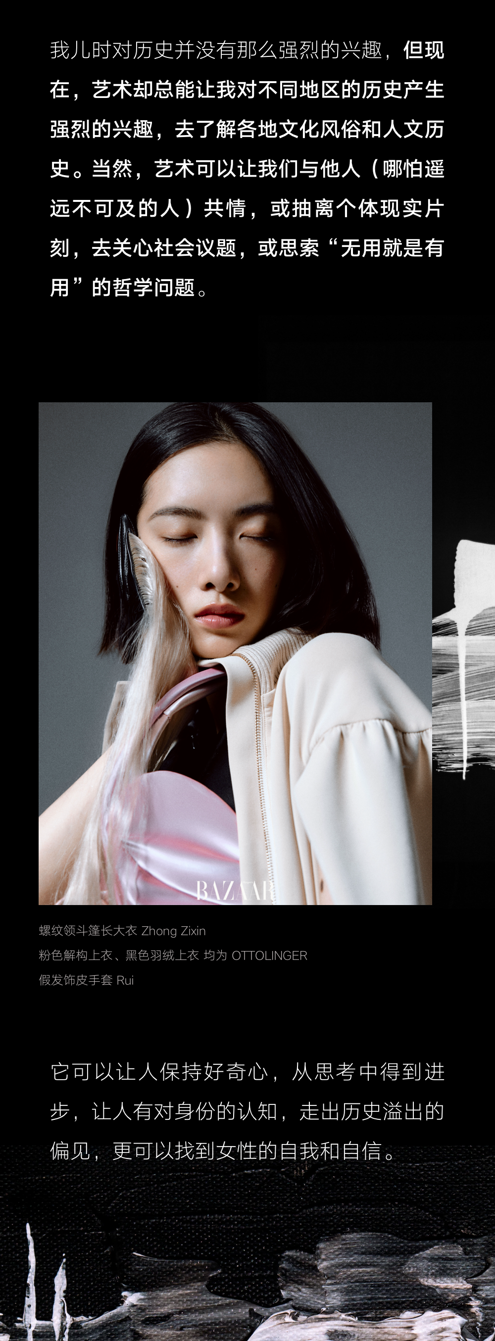这次除了拍摄了MiniBAZAAR十月刊的封面,Cici项偞婧还亲自撰写了一篇关于艺术与女性的文章。穿梭于两种身份,对于艺术世界中的女性和她们的审美表达,Cici项偞婧有着敏锐的观察和独特的体会。