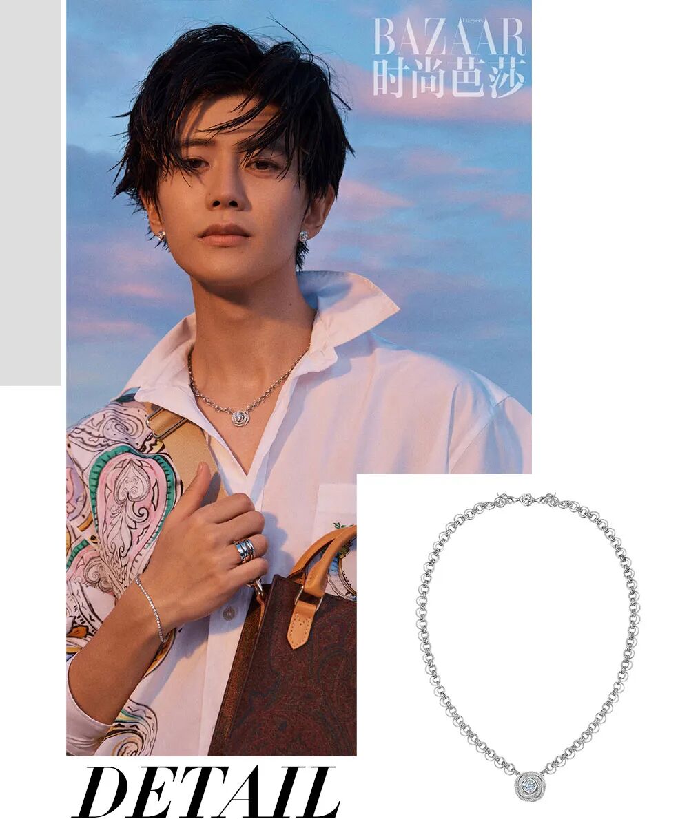 其实黄金首饰不仅因为材质受人追捧,对于中国人来说,我们也很喜欢黄金配饰背后所带来的吉祥寓意。之前做客双十一品牌直播时,任嘉伦曾有一套绸缎拼接的黑色西装的中式风穿搭。他搭配的那条任意门黄金项链,看似简约,实则项链的正面印刻着意为Receive的英文字母“R”,而背面点缀满钻四芒星,仿佛任意门一般,拥有它便能到达想去的地方~除此之外,在年中与《时尚芭莎》合作的拍摄里,嘉伦叠戴的两条充满艺术氛围的周大生×梵高博物馆联名系列挂坠也令人印象深刻。该系列的单品设计以画家梵高的名画《向日葵》为灵感,用不规则的线条勾勒出向日葵的勃勃生机,在显气质的同时也是非常符合当期拍摄的夏日主题了~许多网友都说让嘉伦把西装“焊”在身上,其实这句话可不是空穴来风。因为,出席很多正式工作场合时,干练正式的套装的确是任嘉伦的第一选择~搭配这样的服装,自然也要选择更有高级质感的珠宝展示调性,而周大生MASTER GALLERY系列和都市独白系列就是嘉伦会时常pick的单品。灵感来自星系旋动产生的旋涡与永无止境的莫比乌斯环的周大生MASTER GALLERY系列旋涡星云项链,以造型寓意着永恒。以群钻点缀的星云,辉映中央那颗璀璨生辉的LOVE100星座极光钻石,自然而然地拉升造型的高级氛围~周大生MASTER GALLERY系列旋涡星云项链暖色调的玫瑰金,比起厚重暗色调的服装,更适合搭配浅色调的清爽造型,相辅相成地映衬出干练利落的美感,是提升职场穿搭时髦度的不二秘诀~在周大生的各类钻石珠宝系列中,摩登多样的设计给予了佩戴者更多灵感,不论是想要工艺精巧的高级感,还是在乎简约大气的时髦度,都能找到适合你的那一个。如果说工作中的嘉伦,处处透露着一丝不苟的专业,那么,私下里更享受随性风格的他,则是妥妥的邻家哥哥一位。对于穿搭来说,舒服自然就是最好的,而这也更贴近于他在综艺里所展现的一面。简单的T恤、衬衫,是最常出现在任嘉伦身上的服装单品,一方面这样的搭配穿着起来方便活动,另一方面也符合任嘉伦本身五官自带的那股子少年气~搭配这样的日常造型,任嘉伦就比较喜欢以银饰配饰作为点缀,在兼顾服装本身舒适的同时,潮酷银饰也会赋予整体造型更亮眼的个性细节。出于代言人任嘉伦对银饰的喜爱,周大生品牌还特别为他在周大生多面玩家系列中专门命名了一个主题——「超有引力」~该系列的灵感来源于任嘉伦的日常穿搭,融入品牌与代言人元素,打造了简洁、有力量感的潮酷风格银饰。简约而不失精致的设计,更符合如今年轻人多元化、个性化的审美。在任嘉伦的时尚之路上,我们常常看到其合作伙伴周大生品牌的身影,在配饰方面赋予了他新的灵感与更多选择。而作为代言人的嘉伦,也为周大生品牌带来了更多新的活力。就像每一次新的挑战都能给大家带来新的惊喜一样,对于擅长打造情景风格珠宝的周大生品牌来说,也一直在探索着珠宝首饰设计的多元风格和态度表达。前两天,任嘉伦与周大生品牌再度相遇,出席了《2022周大生品牌年度盛典》,以超时空遇见爱为题,为我们谱写了一场相「遇」之旅。周大生×国家宝藏——千里江山典藏款 18K钻石胸针