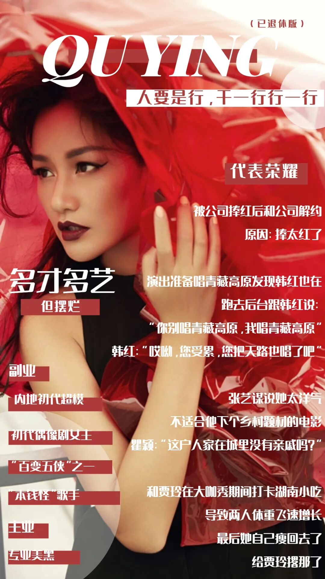 早在年初,“浪姐4”一波又一波的路透就吊足了大家的胃口,节目还没播就先加了满杯的期待值。如今终于盼来了开播,第四代姐姐们的社交现场和初舞台霸榜果然如预期一般热搜,她们如同百花盛放,各有风姿,她们用自己的力量谱写着当代女子群像。小麦色的肌肤、紧实的肌肉线条,瞿颖凭借一双长而直的好腿冲上热搜。让人不禁发出疑问:“到底是她52岁,还是我52岁?”彼时,瞿颖作为初代超模,身着鲜艳的高衩泳装,尽管面庞略显稚嫩,参加选秀时大方展现洒脱姿态。如今,她迈着标志性的T台步伐走上舞台,依旧气场全开!伴随着“安红!额想你!”,电影《有话好好说》的名台词开场,唱着成名曲《加速度》的瞿颖仿佛让时间冻结。对于还不了解瞿颖到底是谁的观众们,粉丝贴心地做了个人简介海报(已退休版),短短一页概括出她多才多艺但摆烂的职业生涯,瞿颖本人看了都点赞。之前的路透图中,朱珠的一瞥便美到人心底。作为最受观众期待的姐姐之一,初舞台上的她将妩媚与柔美透过浅浅的梨涡和笑靥展现得淋漓尽致。