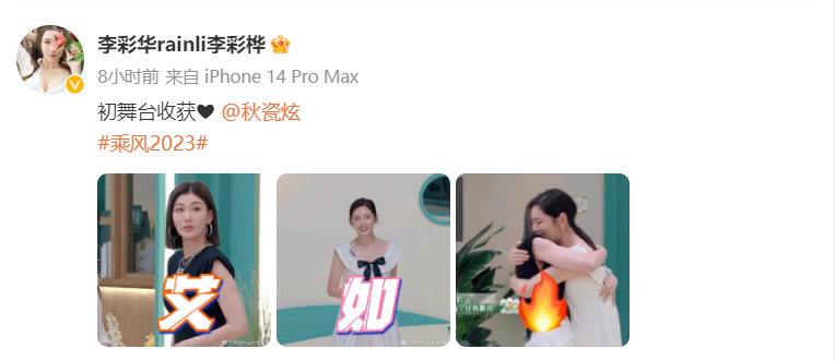 外形的美艳和性格的内敛让她有了非常吸引人的“反差萌”。面对品如和艾莉的世纪重逢和其他姐姐的鼓掌欢呼,朱珠仿佛圈外人的懵圈表情被火速搬上热搜。然而,如果翻看朱珠的社交账号,便可发现这是她惊绝外表背后平淡真实的一面。生活中的她常常以黑框眼镜、自然散落的蓬松长发和素颜示人,日常被话剧排练包围。她以平淡之心置身娱乐圈,将自己潜心演技,正因如此她便拥有了别样氛围感与松弛感。《回家的诱惑》二人组一碰面,几乎所有姐姐欢呼起立鼓掌。见面即拥抱,挽着手打招呼的李彩桦和秋瓷炫,仿佛把现场当作婚礼答谢宴。战歌起!“为所有爱执着的痛……”还记得按时蹲守追剧的那年么?品如艾莉带着青春的记忆回来了!“艾如火”cp,连李彩桦本人都在磕,“洪世贤”都赶来捧场。
