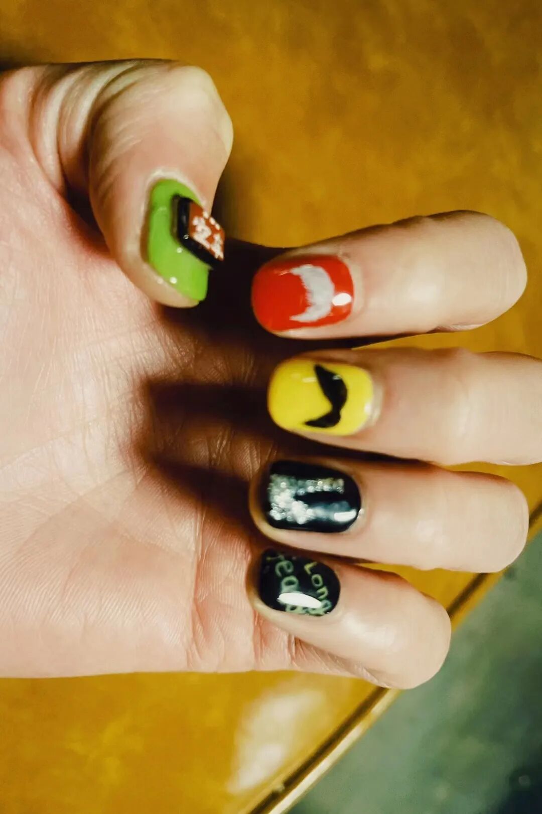 十个手指每一个代表《漫长的季节》里的一个人物:红毛衣是王响、黄色秋衣是龚彪、黑色大V领舞蹈服是马德胜,还有沈墨出刀那晚的蓝色和傅卫军送给殷红发卡上的黑白格,另外两个手指上还有两个凸起的“taxi”和“空车”,都是美甲师在看过他们的戏之后设计和自制的。