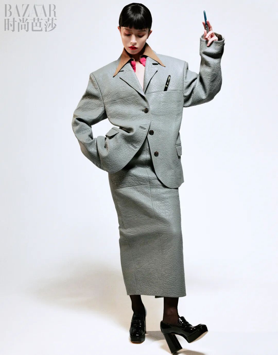 皮质西装外套、半裙 均为Prada
