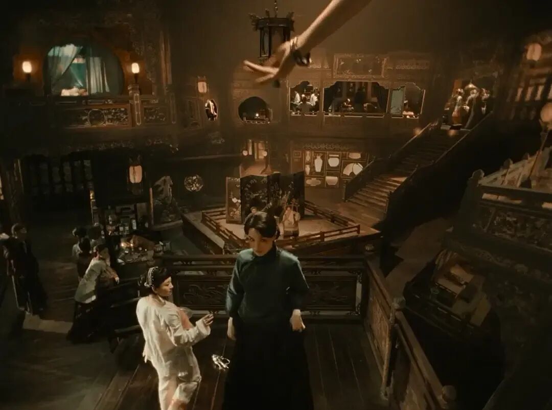 最终,董劲松老师带领的摄影团队采用了早期电影的复合拍摄法:在摄影机前约一米处放置一块位置经过精确计算的亚克力板,在上面绘制鸦片馆的轮廓,并掏空画板的局部,让真实空间通过开口与绘制部分混合。当时的实际布景占地数百平方米,群众演员在真实景深内表演,镜头中则呈现出难以辨识真实与幻觉的叠合效果。