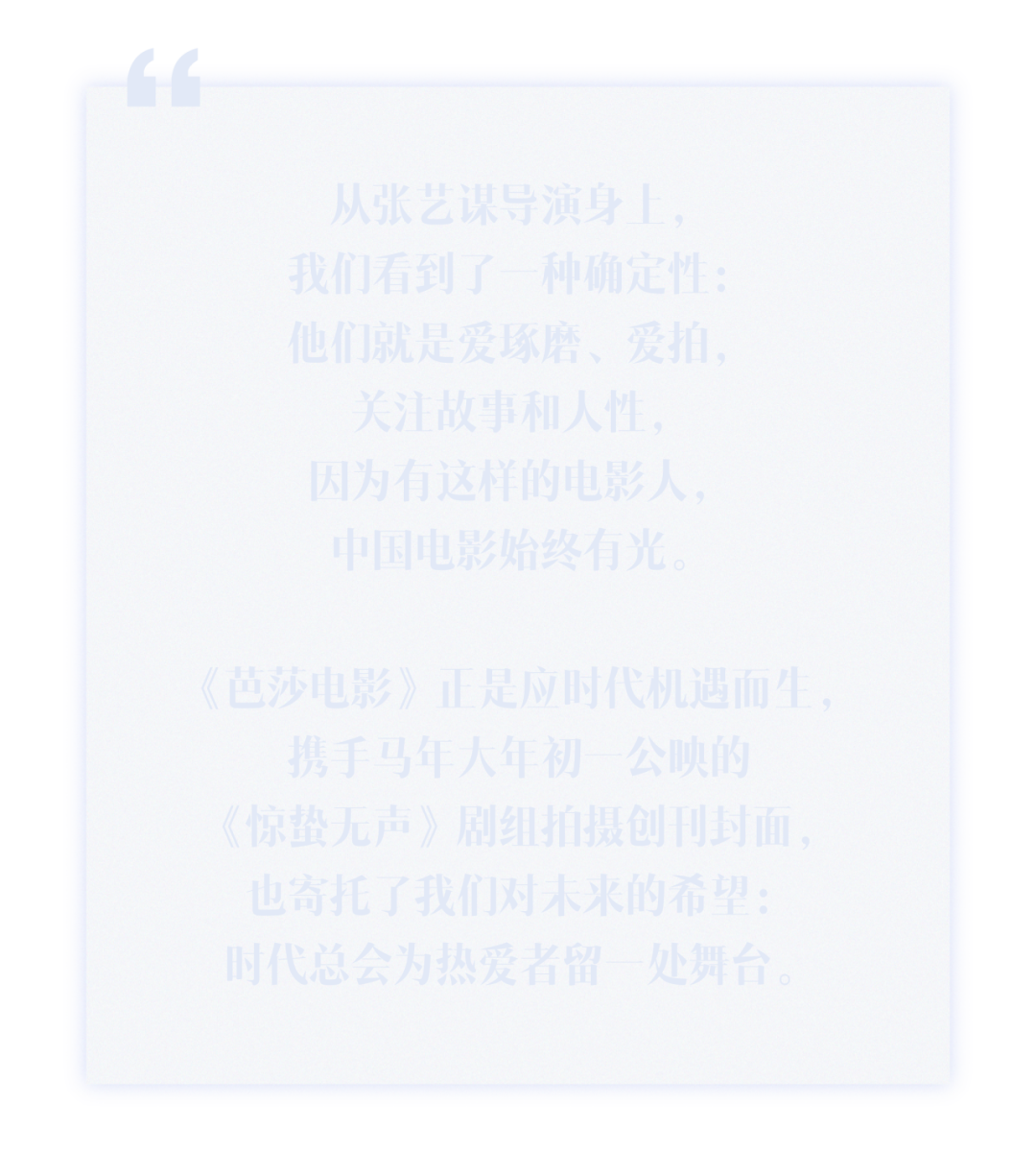 《芭莎电影》编辑部在内部讨论过程中,一致认为张艺谋导演的《惊蛰无声》无论从精神内核还是影片调性上都与创刊号高度契合,理由很充分。