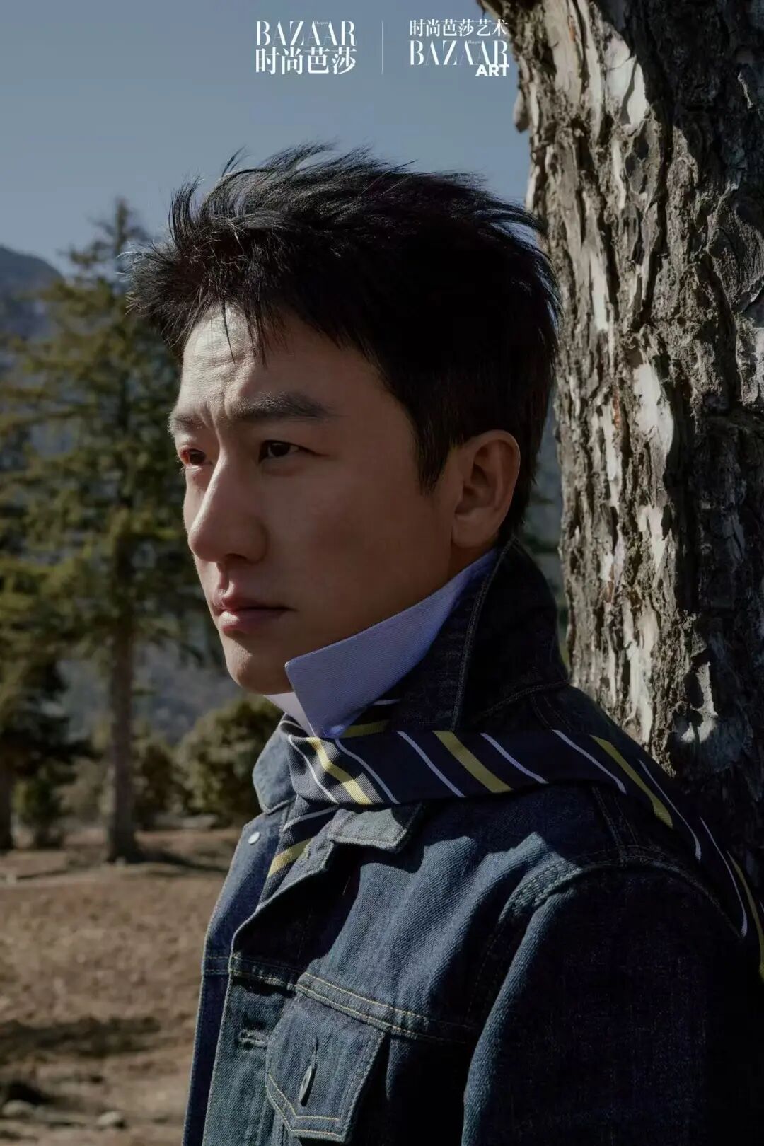 蓝色棉质牛仔夹克、蓝色棉质衬衫、黄色条纹男士丝质领带均为 Dior