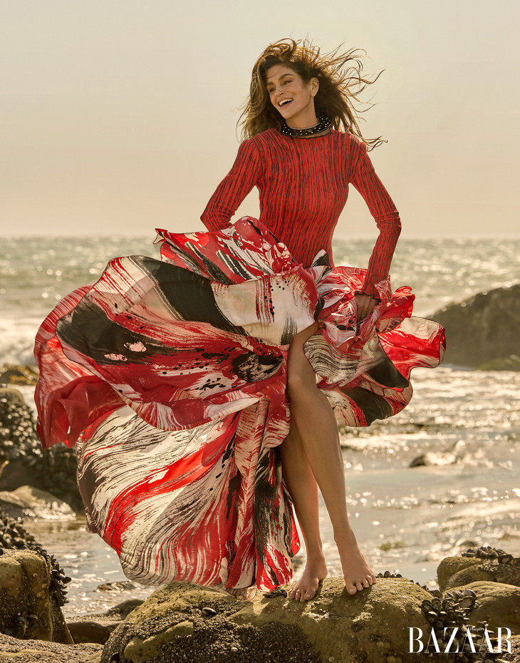在《时尚芭莎》的镜头里,Cindy Crawford光脚站在细腻的沙滩上,海风扬起她标志性的丰盈长发。但当她望向镜头的那一刻,那个风靡了上世纪90年代的超模气场,依然如潮水般不可阻挡。